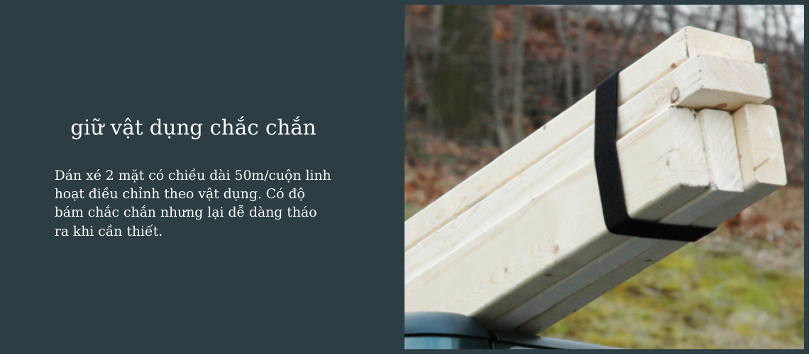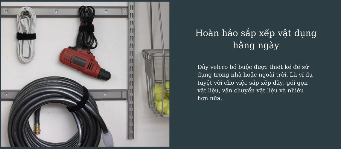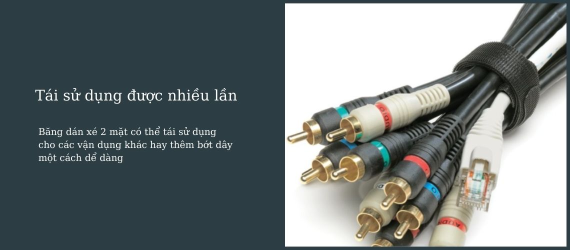 '' Nhanh chóng, dể dàng và chắc chắn là cách mà người dùng mô tả sản phẩm băng dán xé 2 mặt, là sản phẩm hoàn hảo cho việc bó buộc đồ vật, dây cáp và các dụng cụ. Băng dán xé 2 mặt là ví dụ tuyệt vời cho việc tổ chức và quản lý dây cáp mạng, dây điện, thiết bị máy tính, cùng chiều dài cuộn lên đến 50M, người dùng có thể linh hoạt sử dụngtheo vật dụng cần buộc."