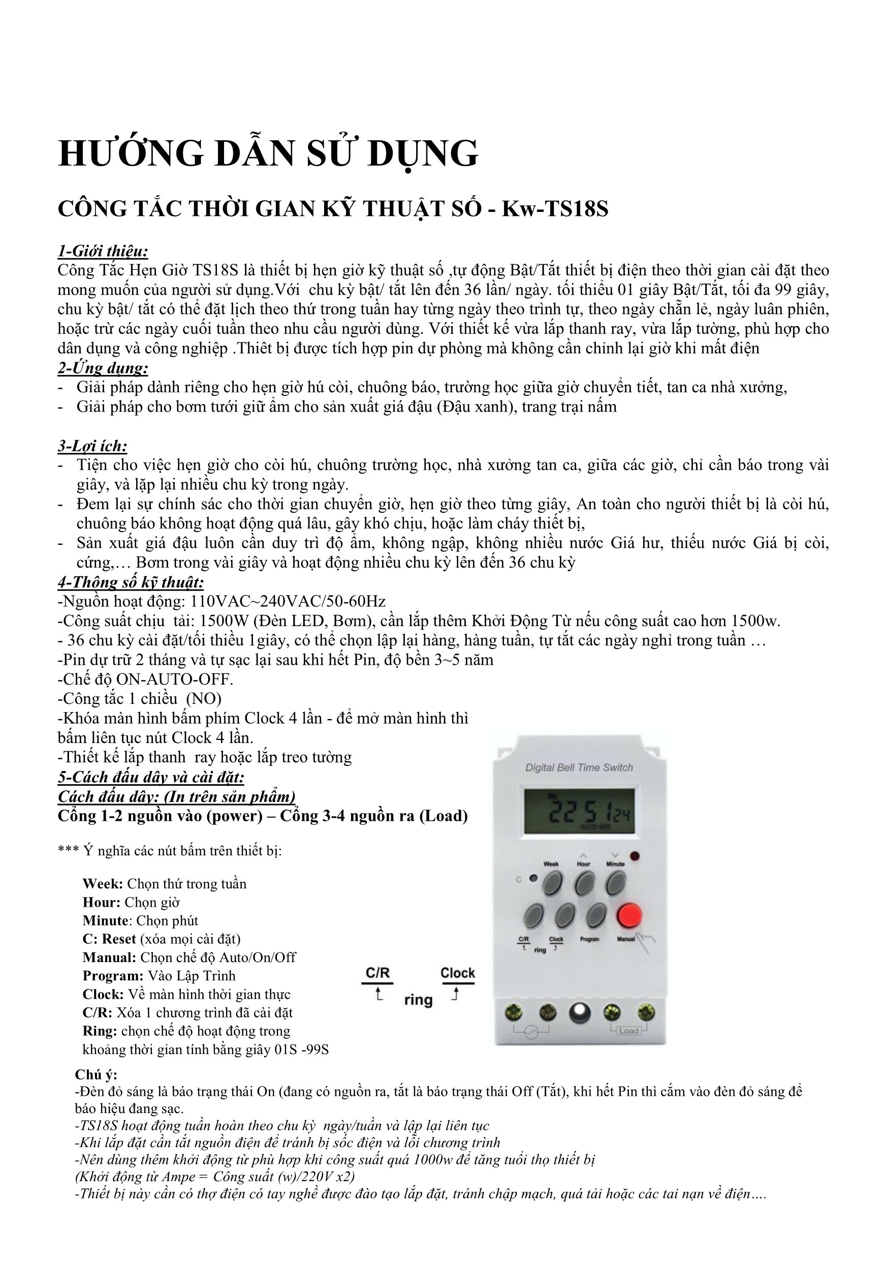 HƯỚNG DẪN SỬ DỤNG CÔNG TẮC HẸN GIỜ REO CHUÔNG TS18S: