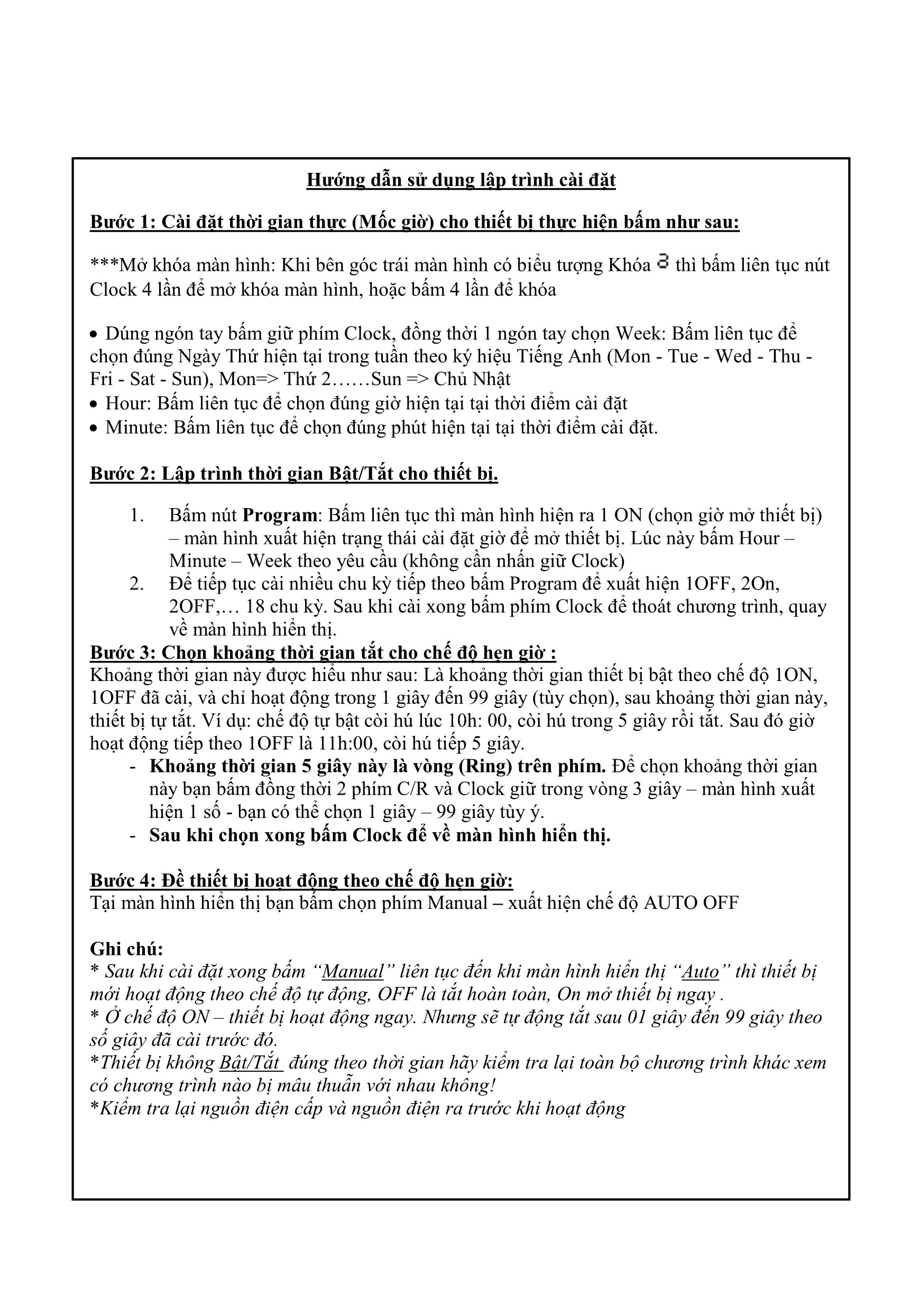 | Cài đặt ON/OFF | 36 chu kỳ cài đặt/tối thiều 1giây, có thể chọn lập lại hàng, hàng tuần, tự tắt các ngày nghỉ trong tuần ... |