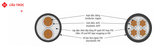 - Thuộc dòng dây cáp điện 3 lõi, 1 vỏ bọc PVC và lớp cách điện XLPE (CÁP ĐIỆN LỰC, RUỘT ĐỒNG, CÁCH ĐIỆN XLPE, VỎ PVC)