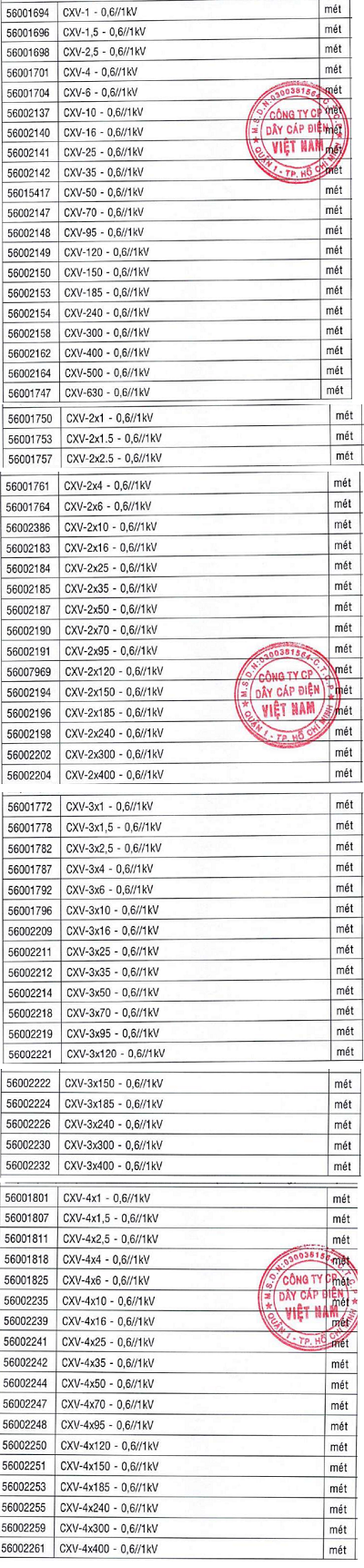 - Cáp CXV dùng cho hệ thống truyền tải và phân phối điện, cấp điện áp 0.6/1kV, lắp đặt cố định