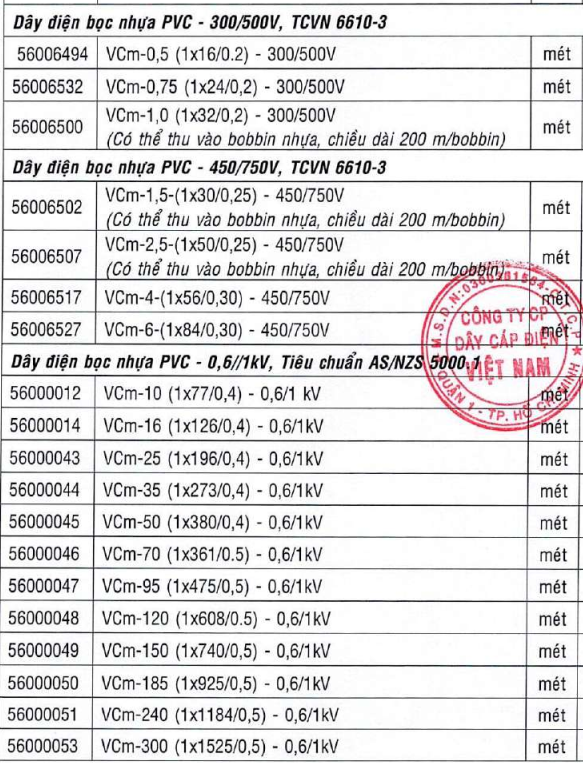 - Tiêu chuẩn áp dụng: TCVN 6612 / IEC 60228 và TCVN 5935-1 /IEC 60502-1