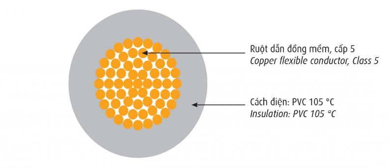 - Thuộc dòng dây điện đơn bao gồm một lõi đồng mềm có cấu tạo từ nhiều sợi đồng nhuyễn mềm, vỏ bọc nhựa cách điện PVC
