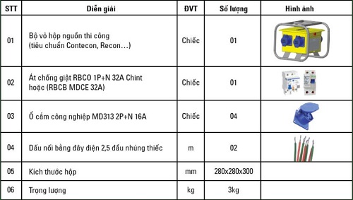 1 CB chống giật 32A Chint ( 1P+N 32A) 1 ổ cắm công nghiệp 1 pha 3 chân 32A IP44 3 ổ cắm công nghiệp 1 pha 3 chấu 16A IP44 1 PG Chống nước |