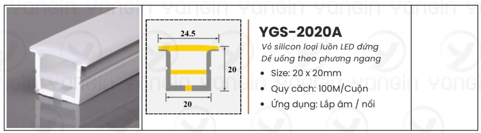 LED silicon âm 20x20 YGS-2020A là sản phẩm trong hệ LED silicon, một trong những giải pháp chiếu sáng nội ngoại thất linh hoạt nhất kiện nay, có công năng tương tự như đèn led thanh nhôm thế nhưng đèn led silicon có ưu điểm hơn về độ linh hoạt bởi đặc tính dẻo, dể dàng uốn cong và tạo hình, bên cạnh đó, khả năng bảo vệ đèn led dây bên trong vượt trội hơn rất nhiều khi có thể chống nước hoàn toàn, chịu được nhiệt độ cao hạn chế ố vàng trong suốt quá trình sử dụng.
